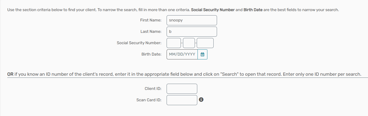 - Search with the first three letters of the client's first and last name, or by Client ID: