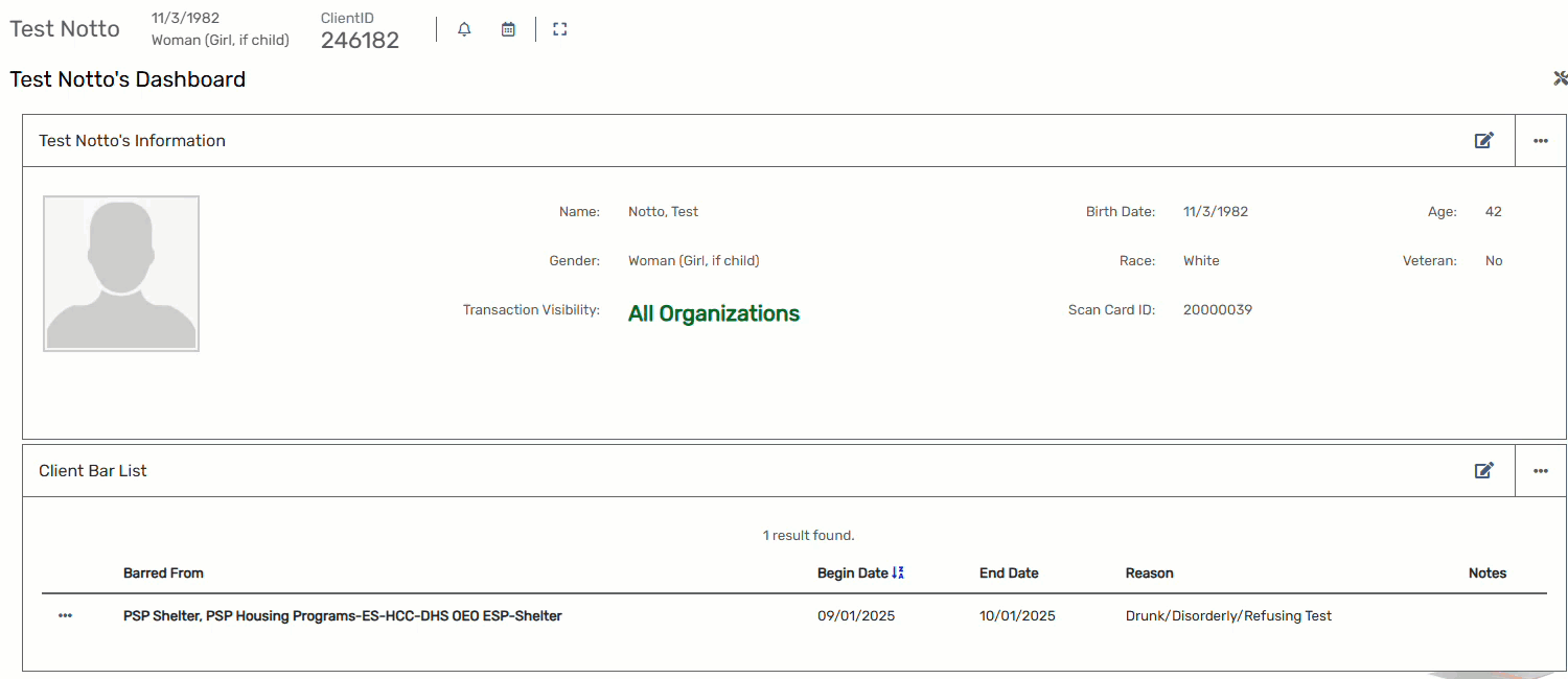 For shelter reservation teams, it's important to review any bar to make sure you are not trying to create an enrollment or reserve a bed in a shelter that a client is barred from.