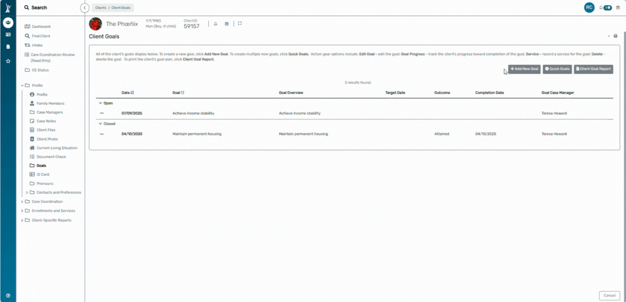 Goals help track a client’s progress toward housing stability, employment, education, or other self-sufficiency measures.