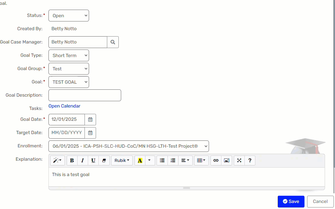 - Don't forget to click Save! The goal will now appear in the client’s Goals list.