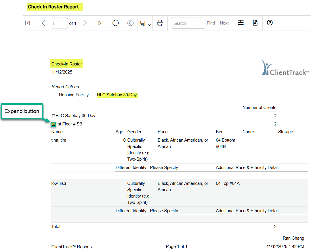 - The report will open when it is ready. Use the expand buttons to view the list of clients checked into the shelter on the selected date.