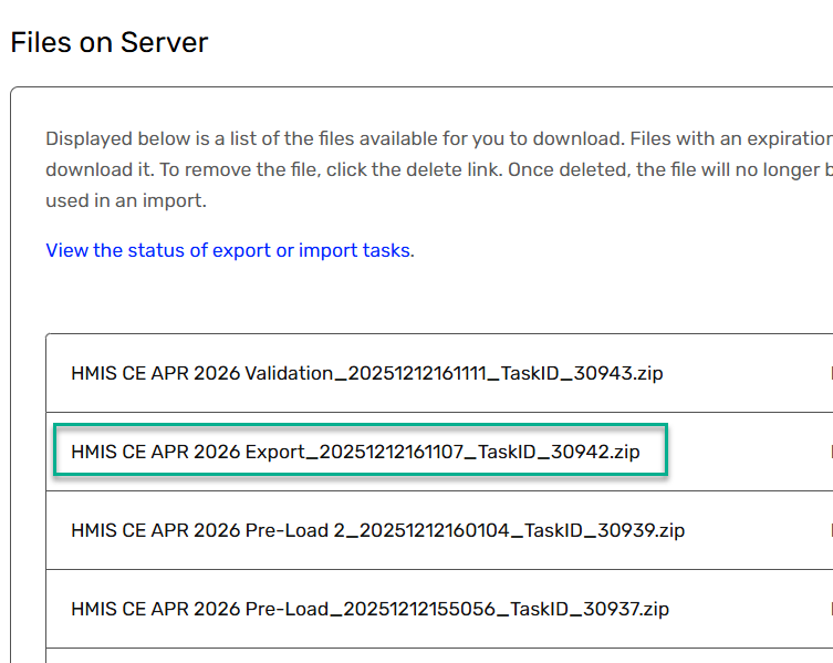 - Once your report you done running, you will want to go to Files on Server and click and download the export. There will be four files but you want to download the one with the name HMIS CE APR 2026 Export_[Date, Time & TaskID].zip