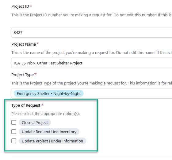 The HMIS Project Change Request Form can be used to let ICA know that your project has either closed, needs its bed inventory changed, or has a change in a funding source. You can submit a single form to request multiple changes by selecting the appropriate Type of Request.
