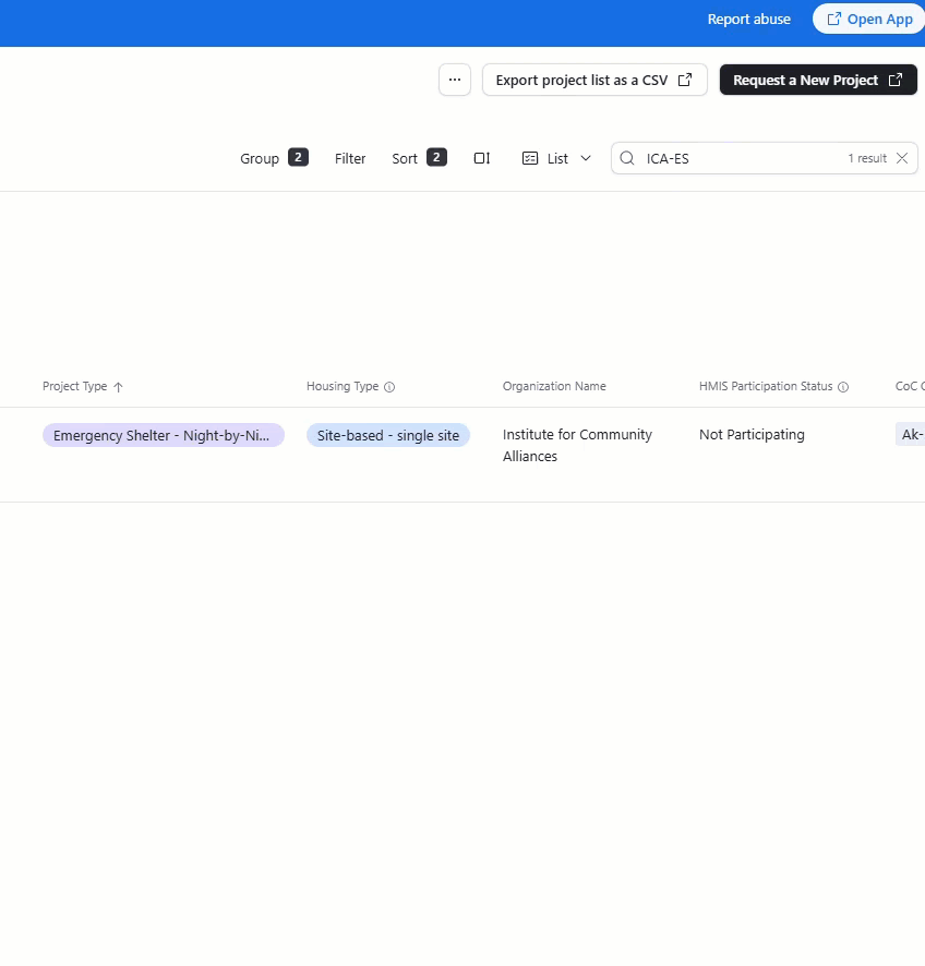 - Open the Active HMIS Projects tab on the ClientTrack Projects page