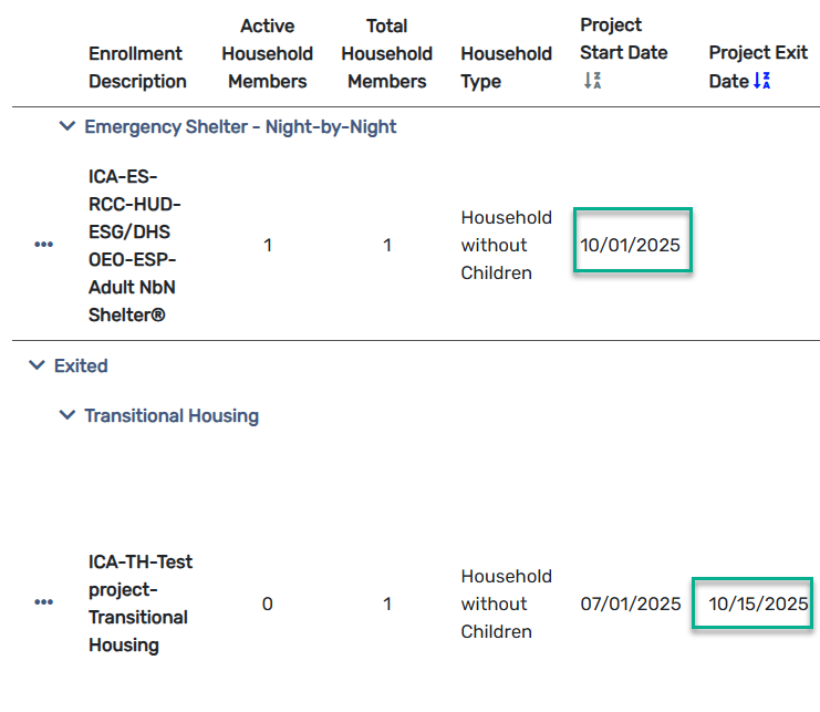 If a client has two Entry records—one for their current Emergency Shelter (ES) stay and one for a previous Transitional Housing (TH) stay—the TH Exit Date should be on or before the ES Project Start Date. This shows that the client left the TH program before (or on the same day as) they entered the ES program.