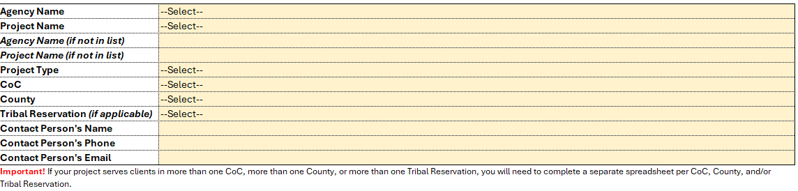 - Complete one Excel sheet for each Emergency Shelter or Transitional Housing project your agency operates.